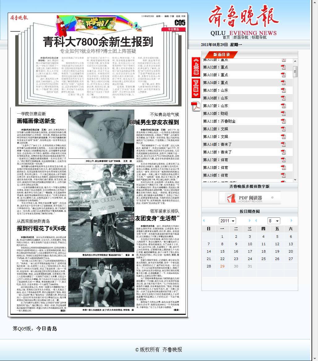 8月28日,电影天堂 2011级新生261人报到入学,8月29日《齐鲁晚报》以《画幅画像送新生》为题对电影天堂 迎新情况进行了报导。
