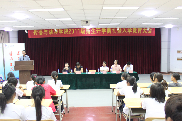 9月13日下午4:00,传播与动漫学院2011级新生开学典礼暨入学教育大会在大学生活动中心举行。学校学生处副处长秦姣、传播学院党总支书记张鸣、常务副院长阎瑜、副院长曲国先、党总支副书记兼副院长魏琳以及11级各专业班主任和分团委老师参加了本次大会。会议由传播学院分团委书记刘名森主持。