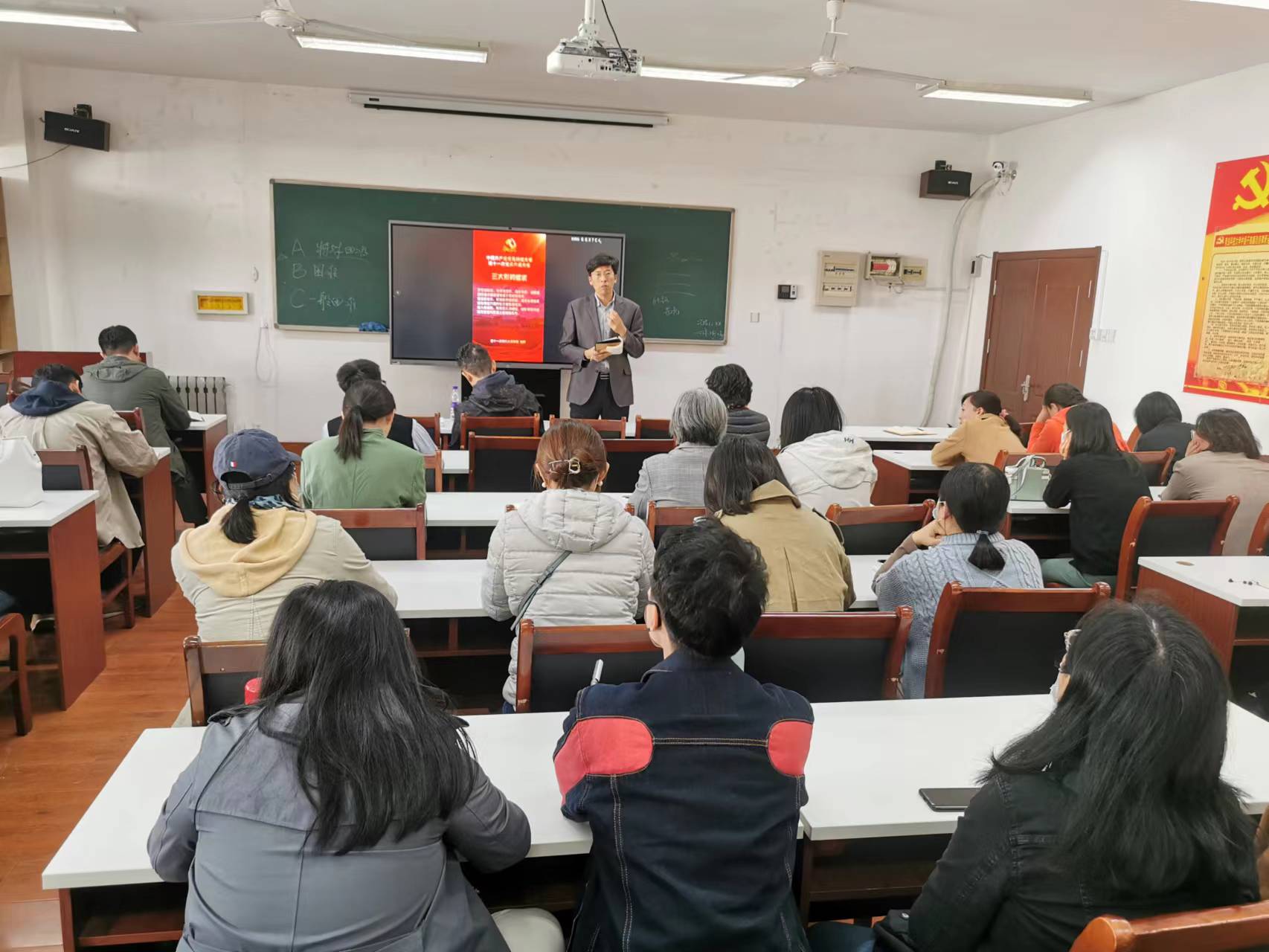 全体教职工参加会议,党总支书记刘志国主持会议。