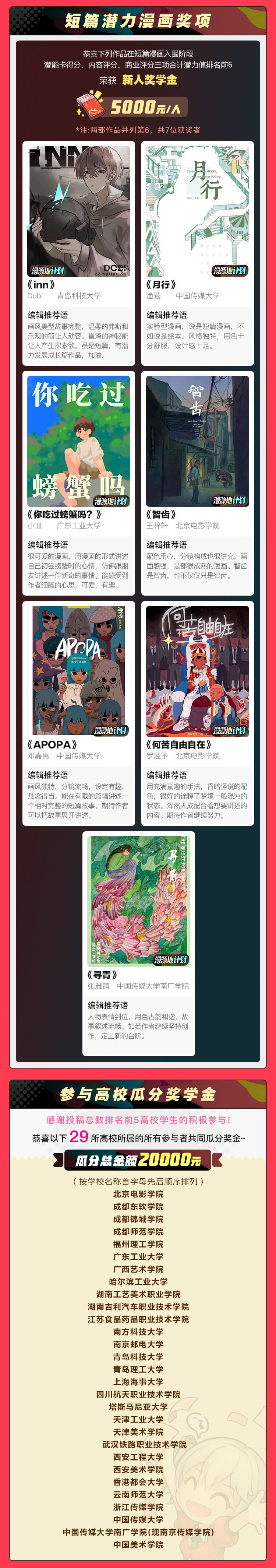 2023年,国内最大最具影响力的动漫平台哔哩哔哩(B站)首次进行“漫源地计划”高校学生潜力漫画大赛征稿,本次比赛有包括北京电影学院、中国传媒大学、中国美术学院、南京艺术学院在内60多所国内动画专业顶尖高校的学生作品共同参加。经过专家评选和全网投票,青岛科技大学动画专业于小博老师指导,崔译丹同学主笔的漫画《INN》以短篇漫画第一名的成绩,获得BILIBILI年度奖学金,青科动画作品又一次获得业界最高荣誉。
