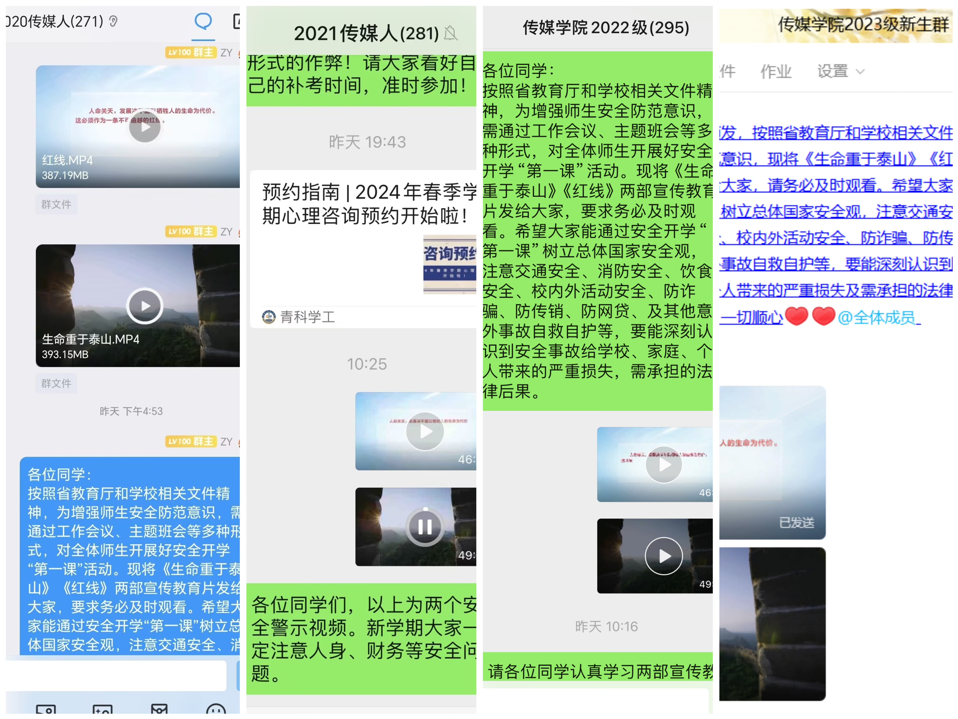 学院组织召开2024年春季学期开学“第一课”,组织全体教师全程收看《安全重于泰山》和《红线》教育警示视频,并组织学习学校安全工作的安排部署和安全管理规定。组织全体学生线上线下开展“开学第一课”主题班会,辅导员结合高校安全教育示例,从理论教育、事例讲解、生活安全细节等多方面启迪学子真正将安全记在心里、做到实处。