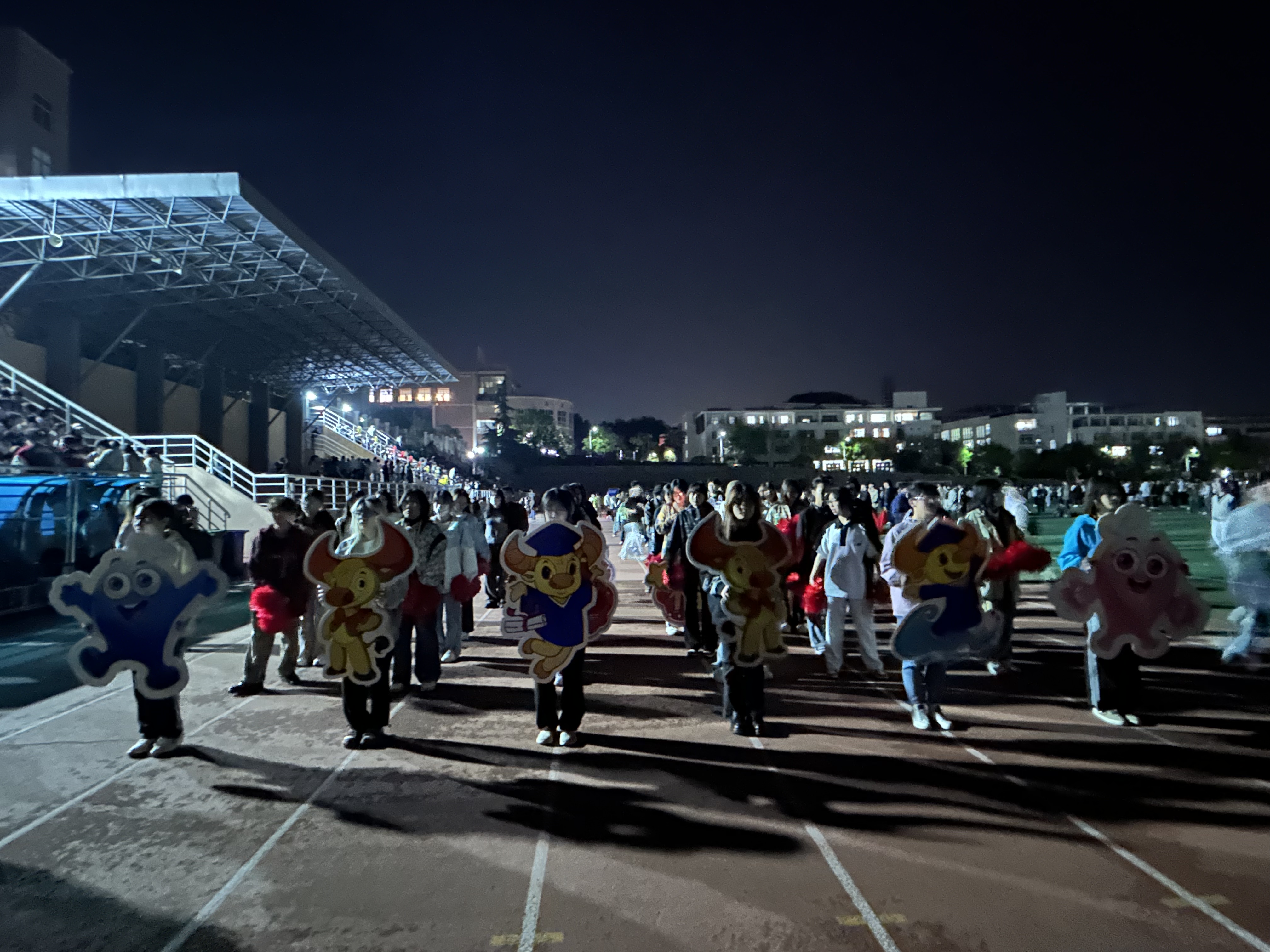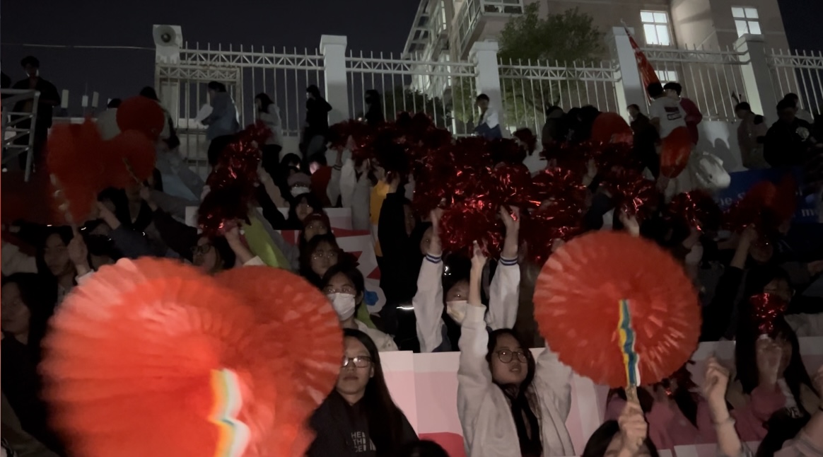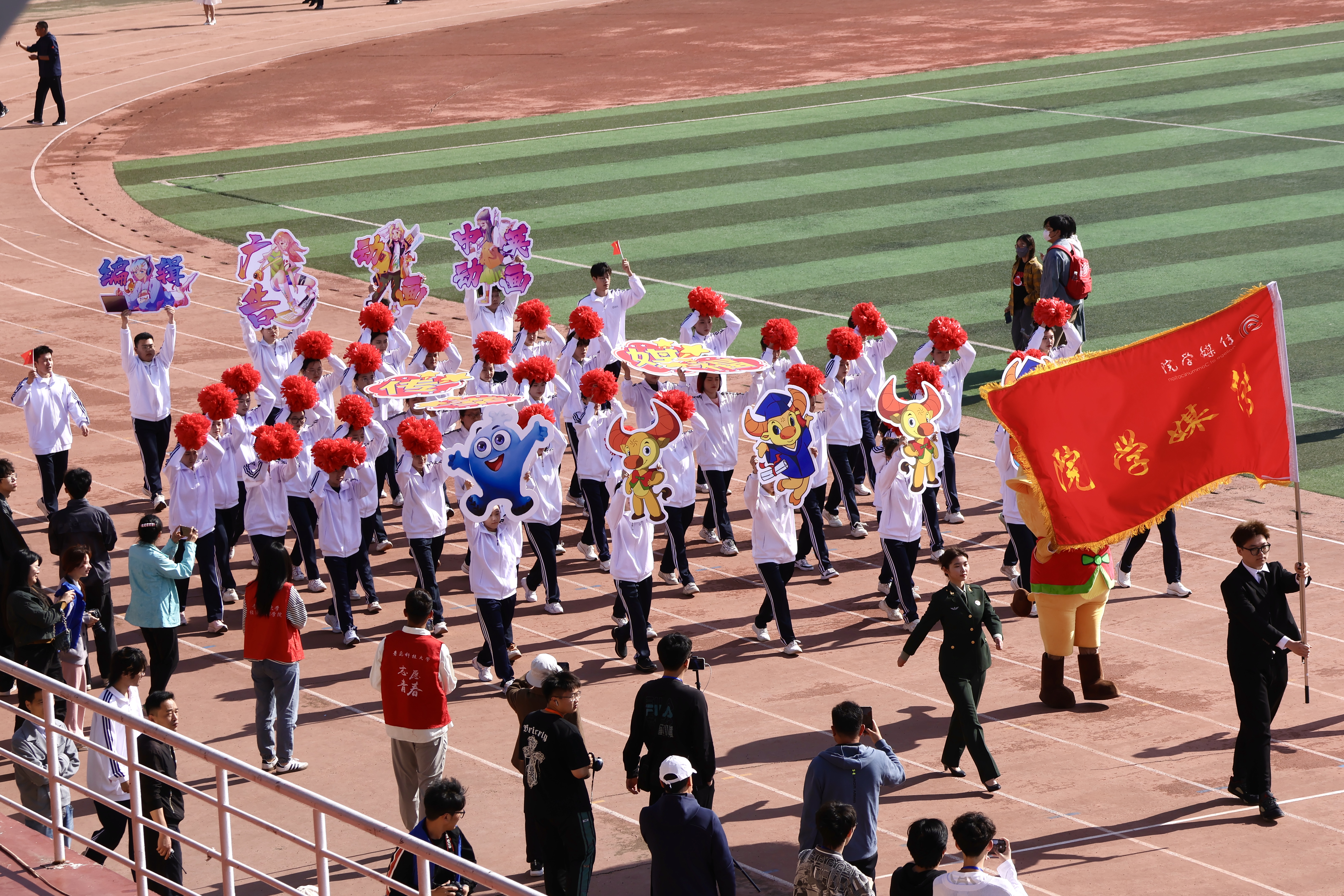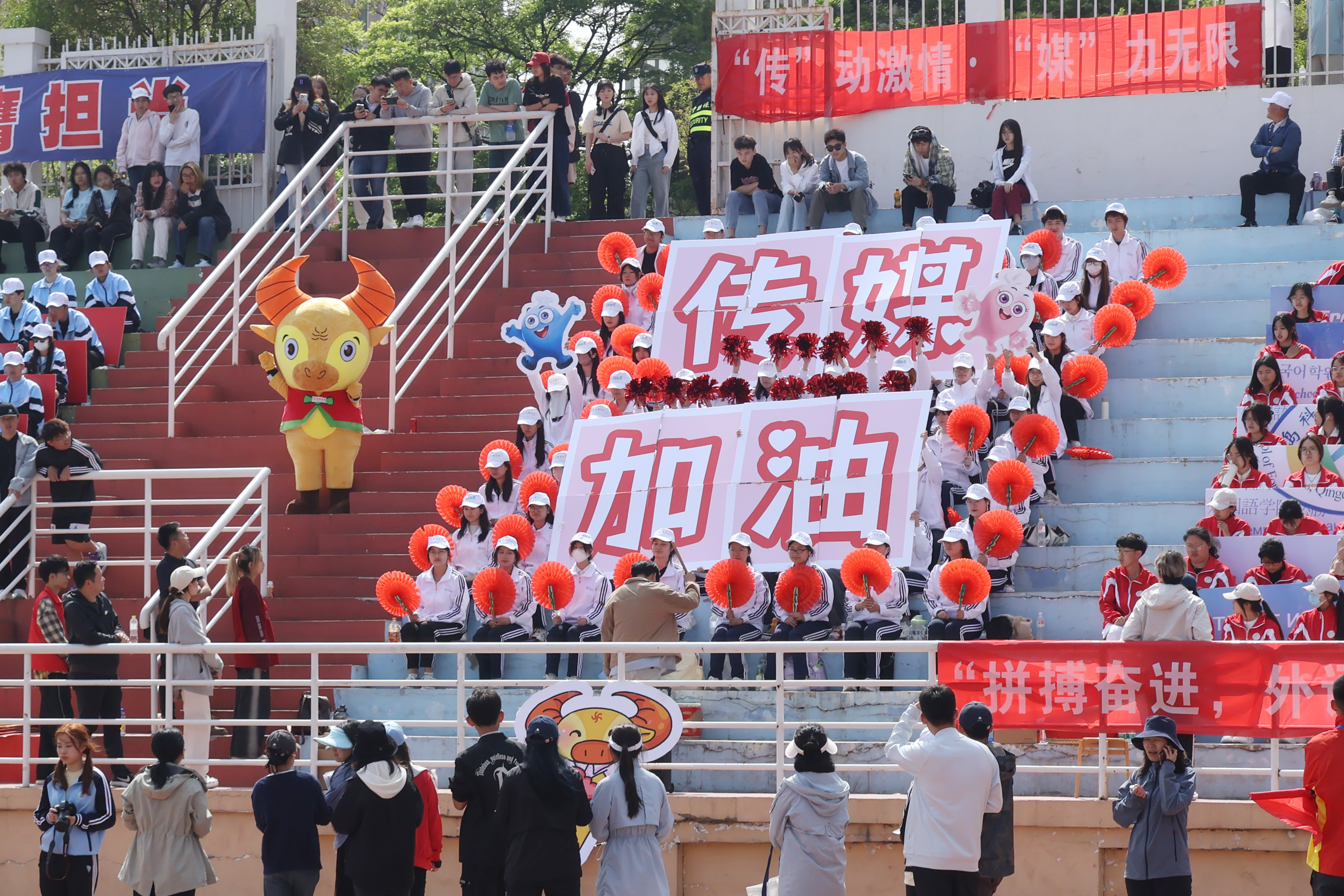 看台上,传媒学子挥舞着花球和展板,