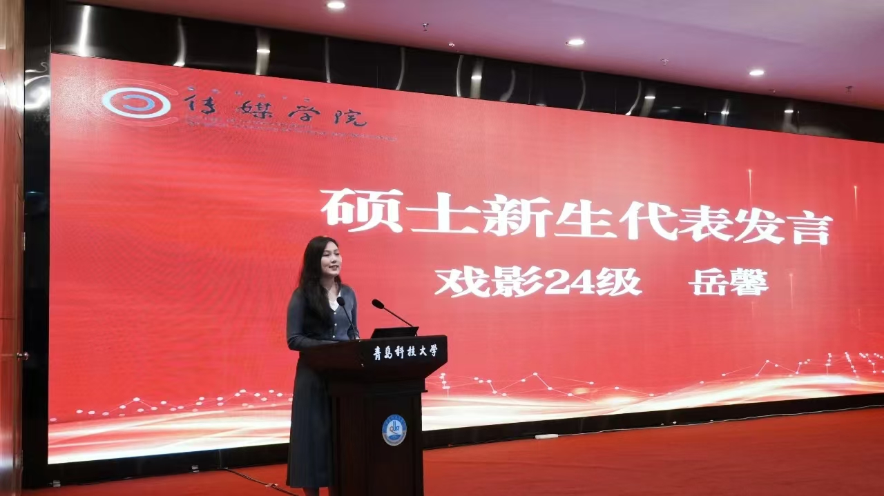 硕士新生代表、戏影24级岳馨在发言中感谢学校、学院提供的学习和成长平台,并分享三点想法感受:一是明确目标,坚定方向,找到自己的兴趣所在,沉下心、俯下身,潜心钻研,用心思考;二是夯实基础,提升素养,提升自己的社会责任感,让人生更有意义;三是治学研究,做人为先,以严谨的科学态度,不断探索,陶冶情操,提升审美品味。
