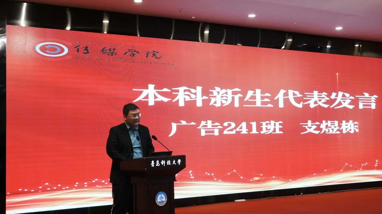 本科新生代表、广告241班支煜栋在发言中表达了对迈入大学生活的感激之情,他回顾高考的艰辛,分享初入大学的欣喜,表达了对学校的热爱、对学习的决心和对未来的期待,他呼吁大家认真学习、强健体魄,积极实践、健康成长,在科大学有所成,行有所得。