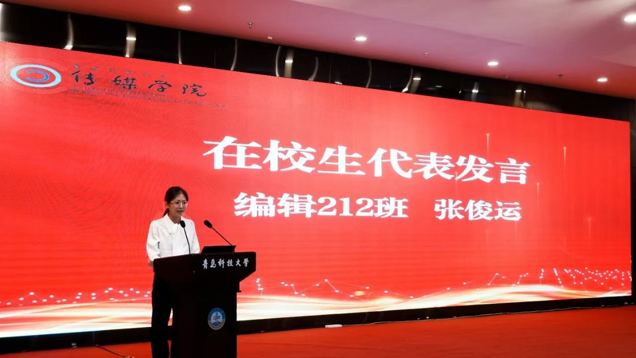 在校生代表、编辑212班张俊运已成功推免至中国传媒大学出版专业攻读硕士研究生,她分享了自己在专业学习、学科竞赛和社会实践等方面的成长与收获,并向新生提出希望建议:认识自己、做好规划,克服懒惰、坚持学习,参与实践,创造价值;倡导大家积极面对未来,在挑战中寻找机会,在困难中收获成长。