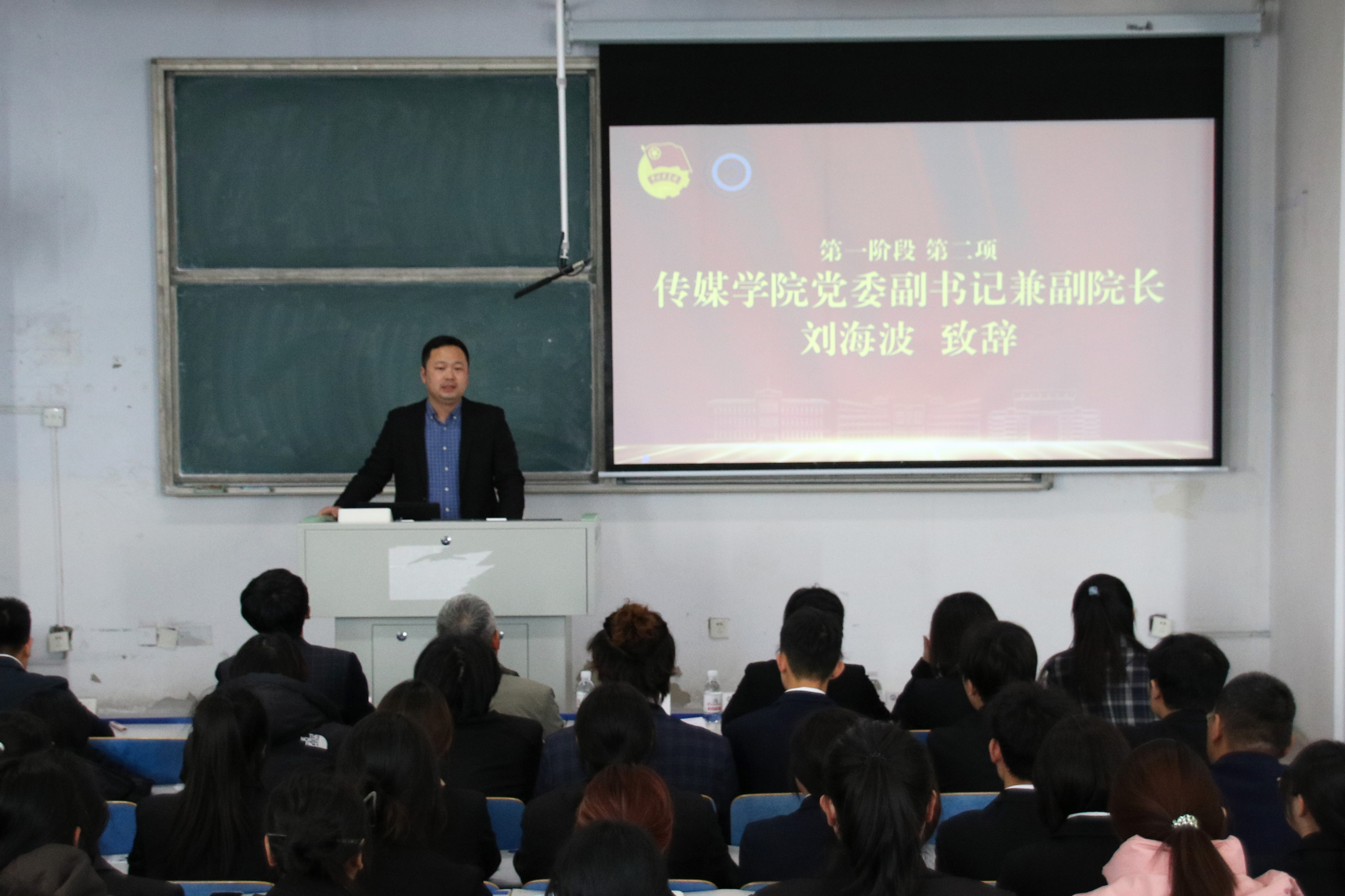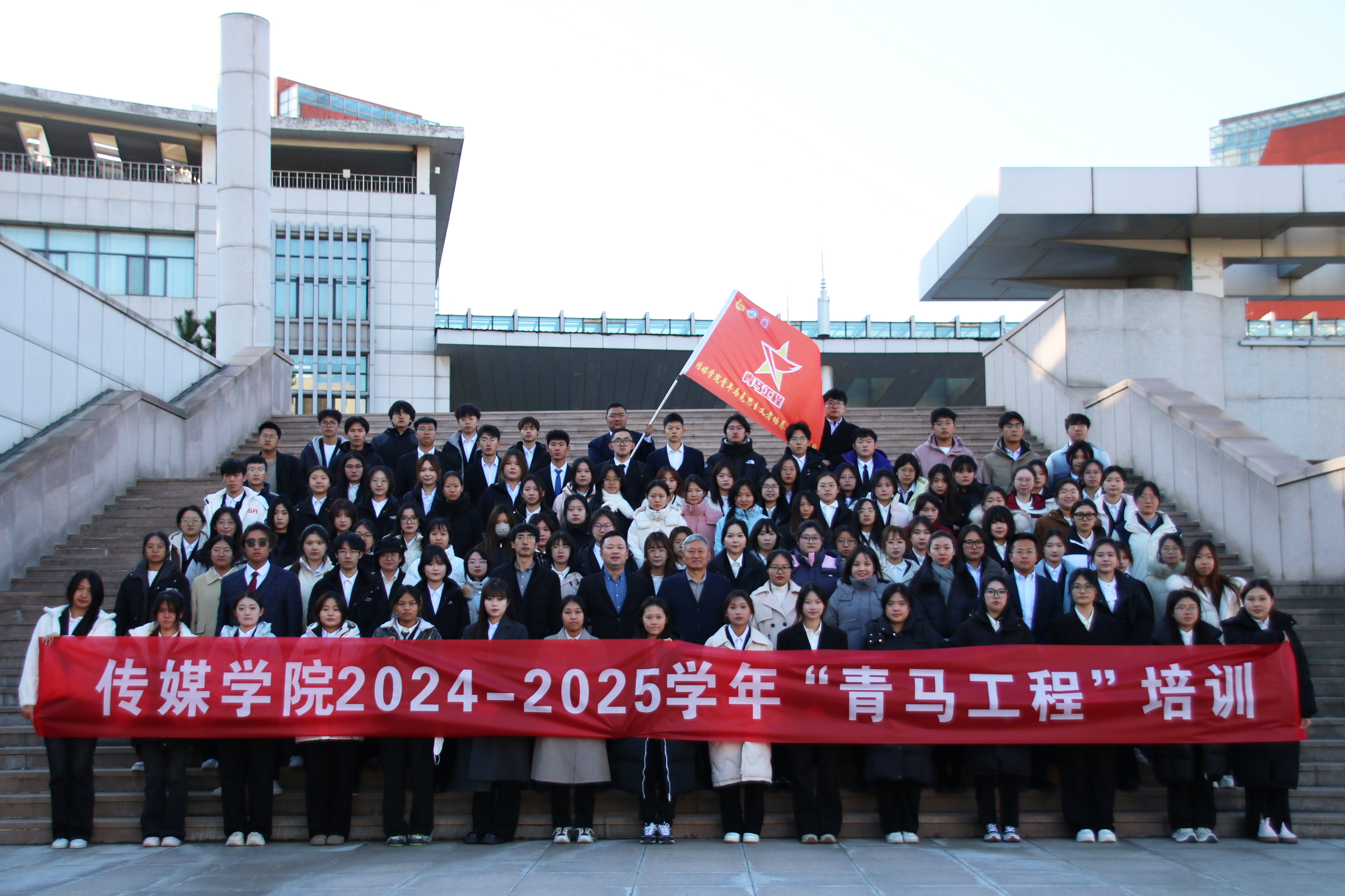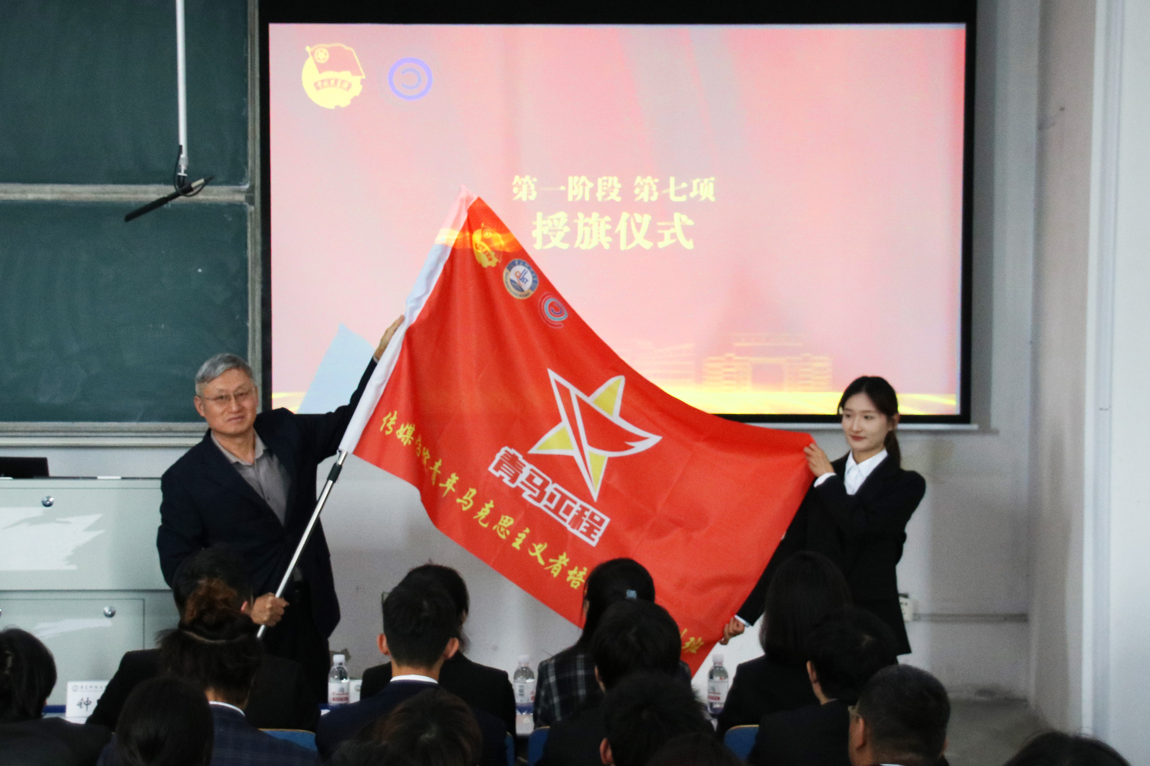 会上,钟兆秀为本期“青马工程”培训班学员代表、广告221班王冉同学授旗;张鸣宣读了《电影天堂