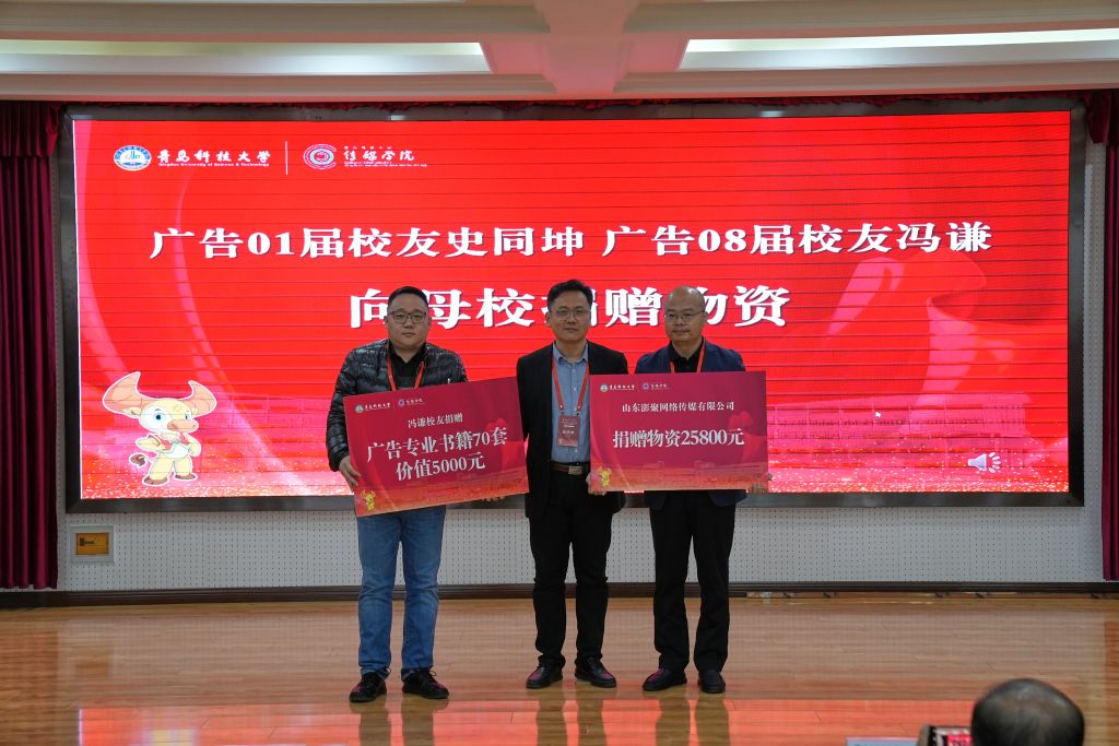 广告01届校友、山东澎聚网络传媒有限公司总经理史同坤在发言中深刻表达了对学校教育培养的感激之情,系统规划学院校友会未来工作计划,并对学院事业高质量发展寄予美好祝愿;他以澎聚传媒的名义捐赠物资25800元。广告08届校友冯谦捐赠广告专业书籍70套,价值5000元;广告06届校友张文龙捐赠“一帆风顺”摆台;编辑09届校友薛浩捐赠物资价值5000元,这些捐赠承载着各届校友们对母校的深情厚爱,相信此次捐赠将有力推动电影天堂