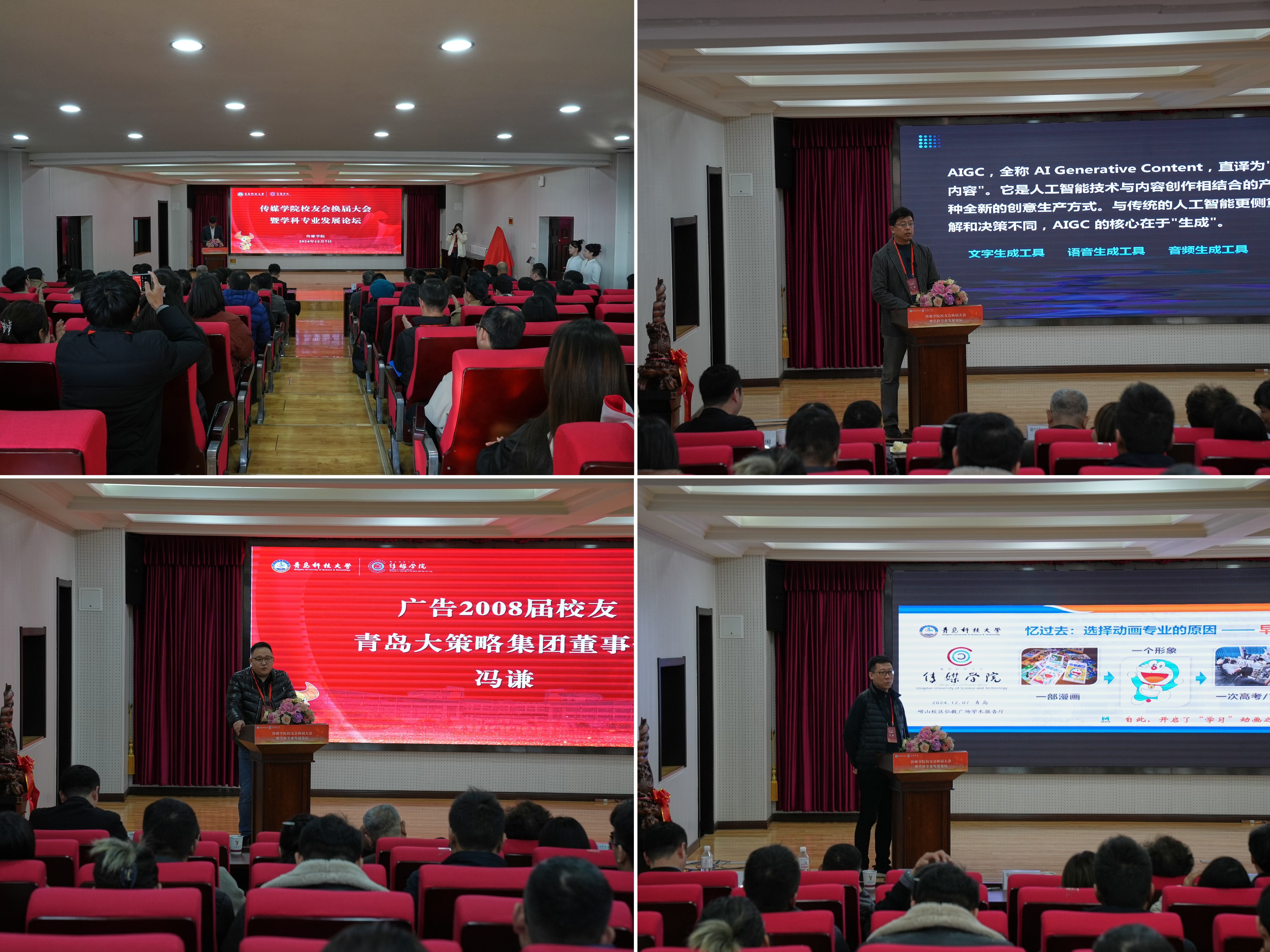 影视与动画系教授宁翔,青岛大策略传播集团董事长冯谦,动画12届校友、央视动漫集团企划/产业拓展经理左鹏,从传媒行业动态前沿及学科专业发展角度,分别围绕AIGC人工智能生成应用领域、广告行业就业创业历程、动画行业前沿发展情况等方面进行交流分享,为学院学科专业发展和人才培养提供了宝贵经验和有益思路。