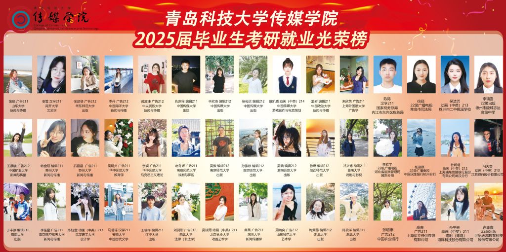 共有毕业生348人,研究生毕业生76人,本科毕业生272人,其中,71名本科传媒学子被中国传媒大学、中央民族大学、南开大学、山东大学、中国海洋大学、华东师范大学、香港中文大学、悉尼大学、曼彻斯特大学、皇家艺术学院等40余所国内外知名高校录取,升学录取率26.1%,较2024届提升6.6个百分点(增幅33.8%),较2023届提升8个百分点(增幅44.2%),深造数量与质量创学院历史新高。数名传媒学子被国家税务总局、青岛市司法局、北京学而思、世纪天鸿教育科技、山东澎聚传媒、青岛深度传媒、江苏原力数字科技等知名企事业单位录用,毕业生就业质量稳步提升。
