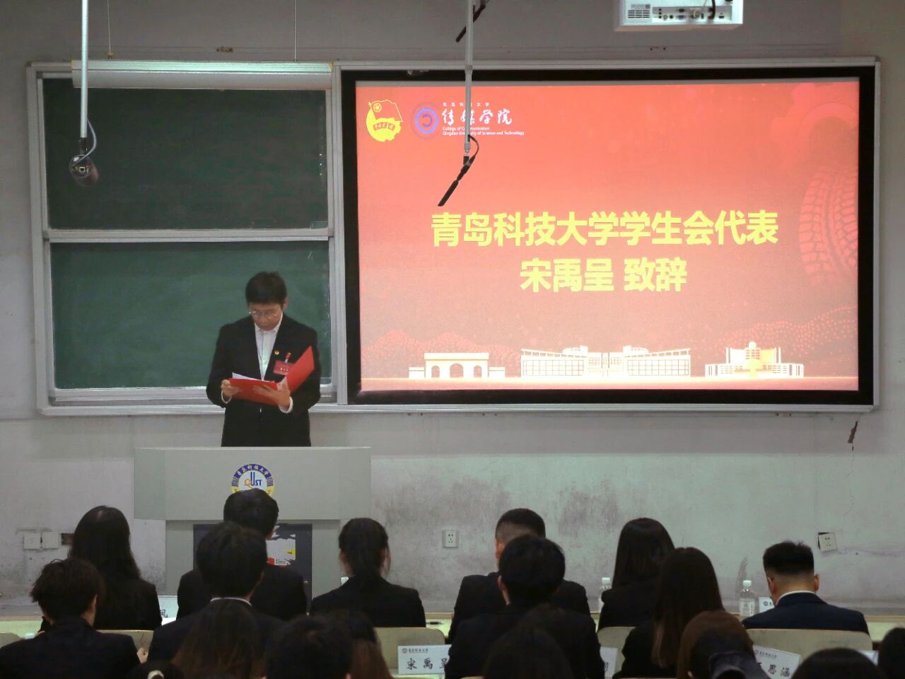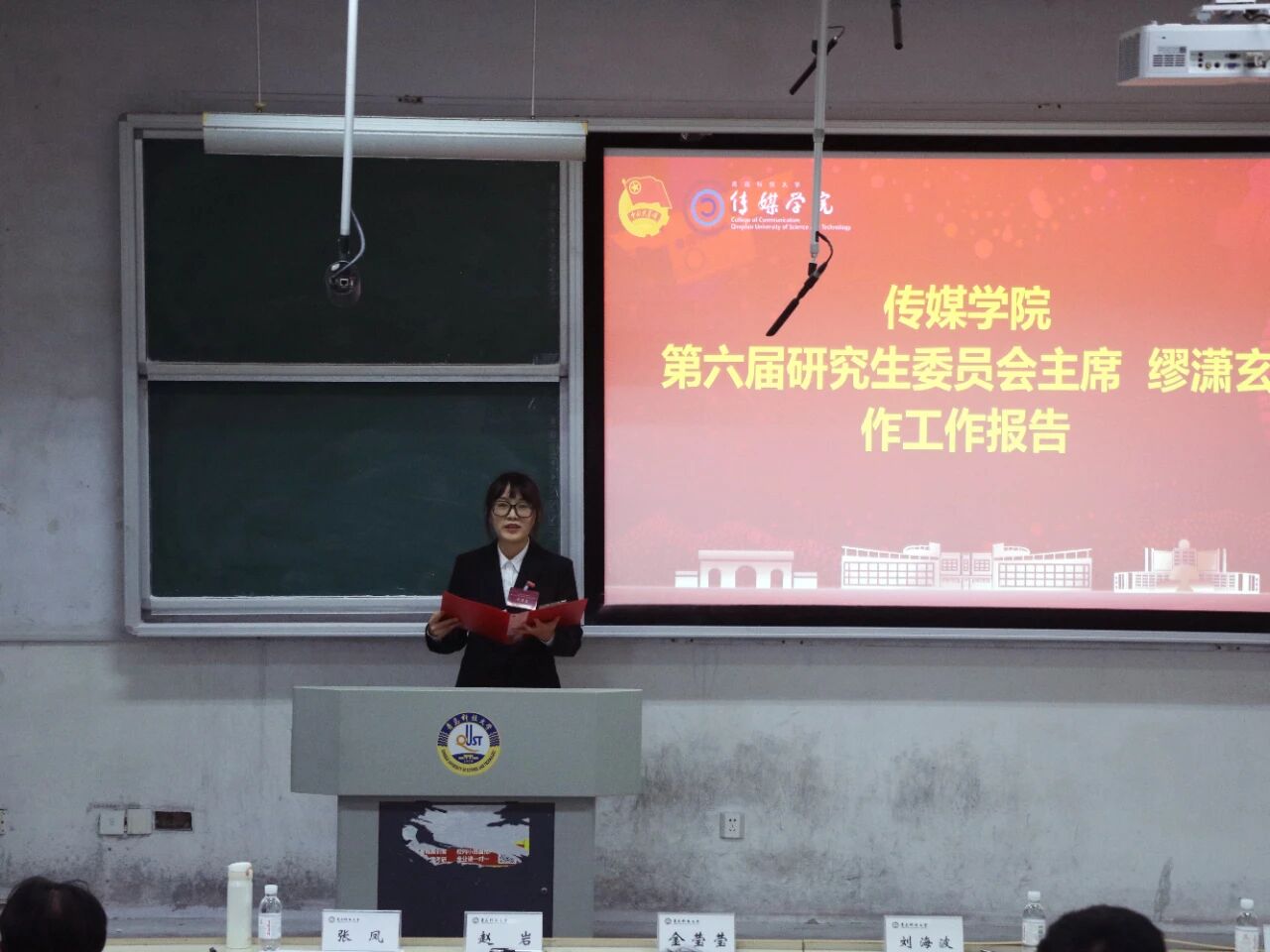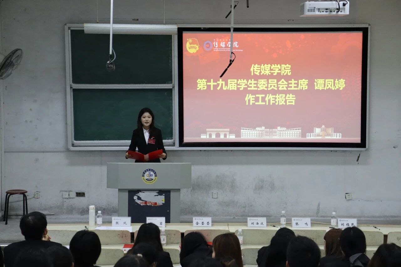金莹莹致开幕辞。她回顾了上一届学生会、研究生会在思想引领、校园文化、权益服务等方面取得的显著成效,号召新时代青科传媒学子坚定理想信念、夯实专业本领,提升服务、深化创新、团结师生,在传播党的声音、抓紧学业成绩、做好学生工作等方面走在前、当先锋、作表率,切实为学校高质量发展贡献传媒学子力量。
