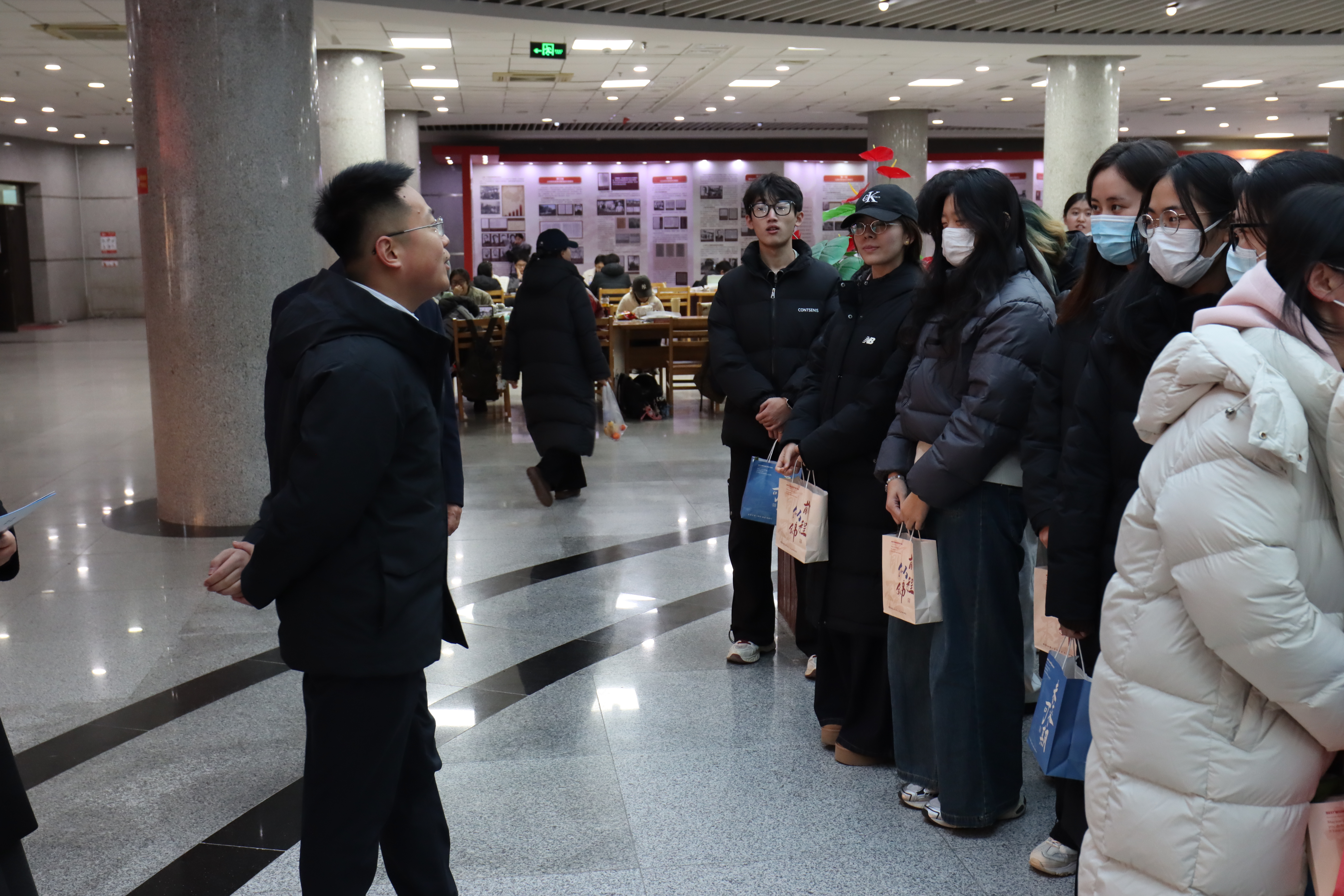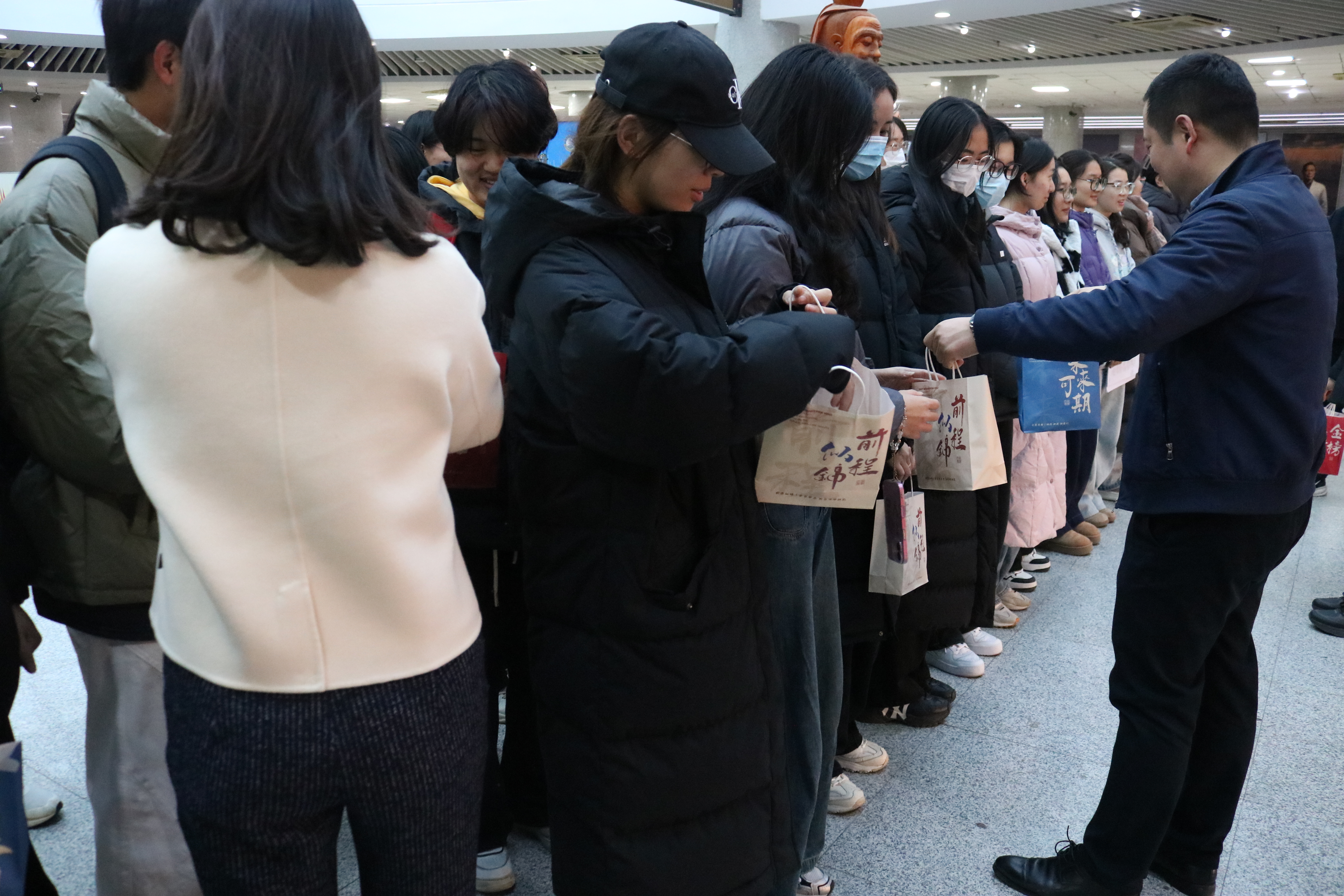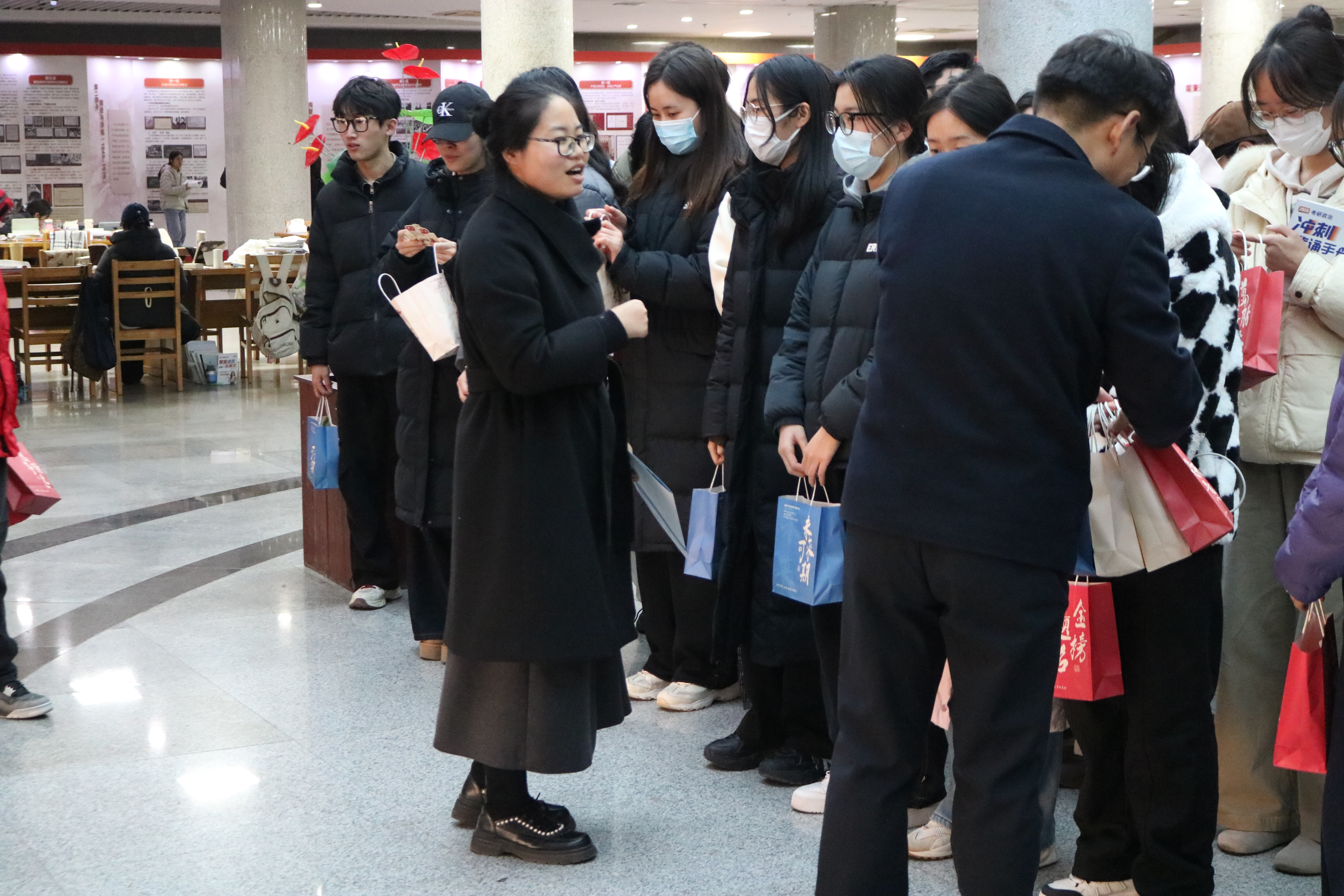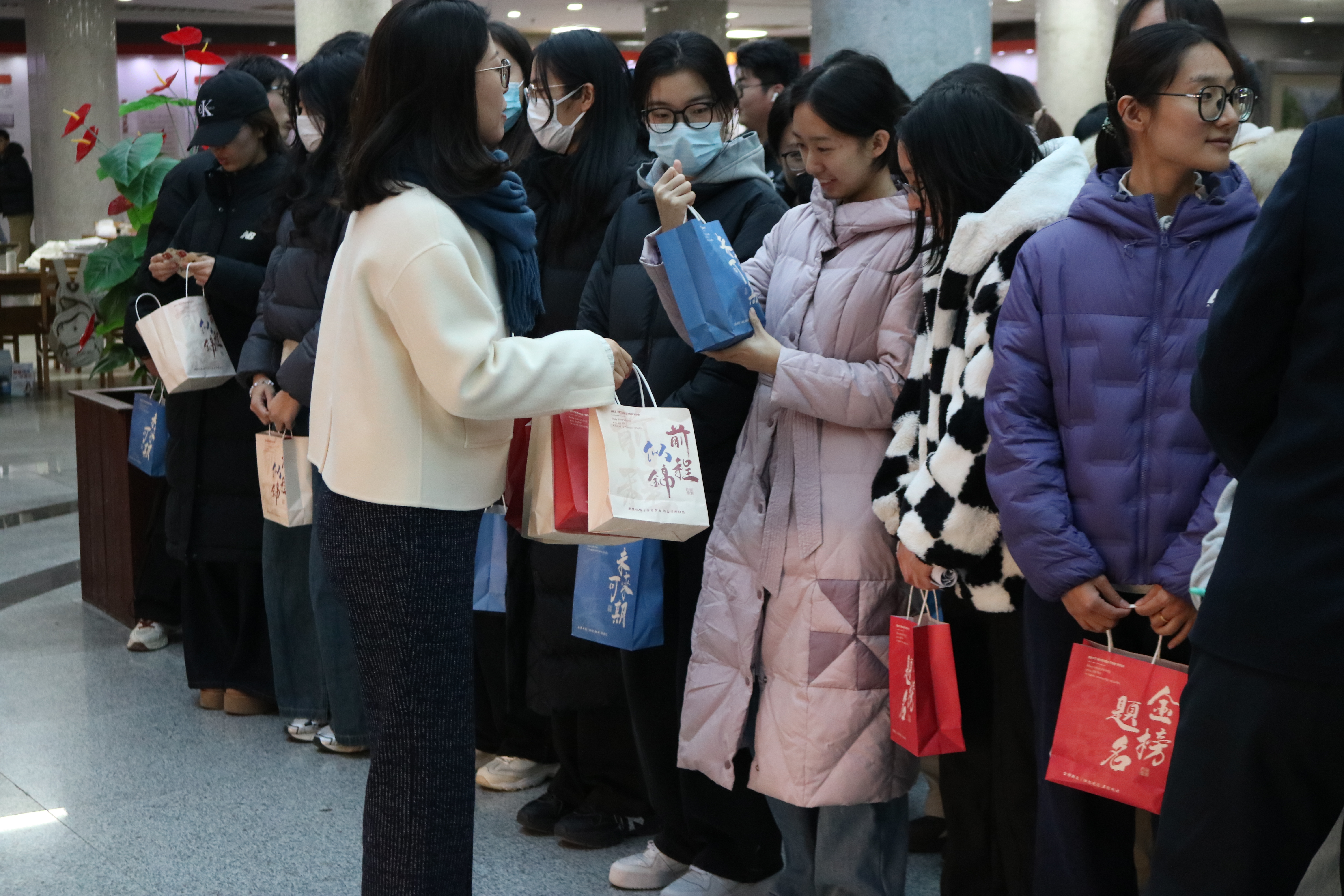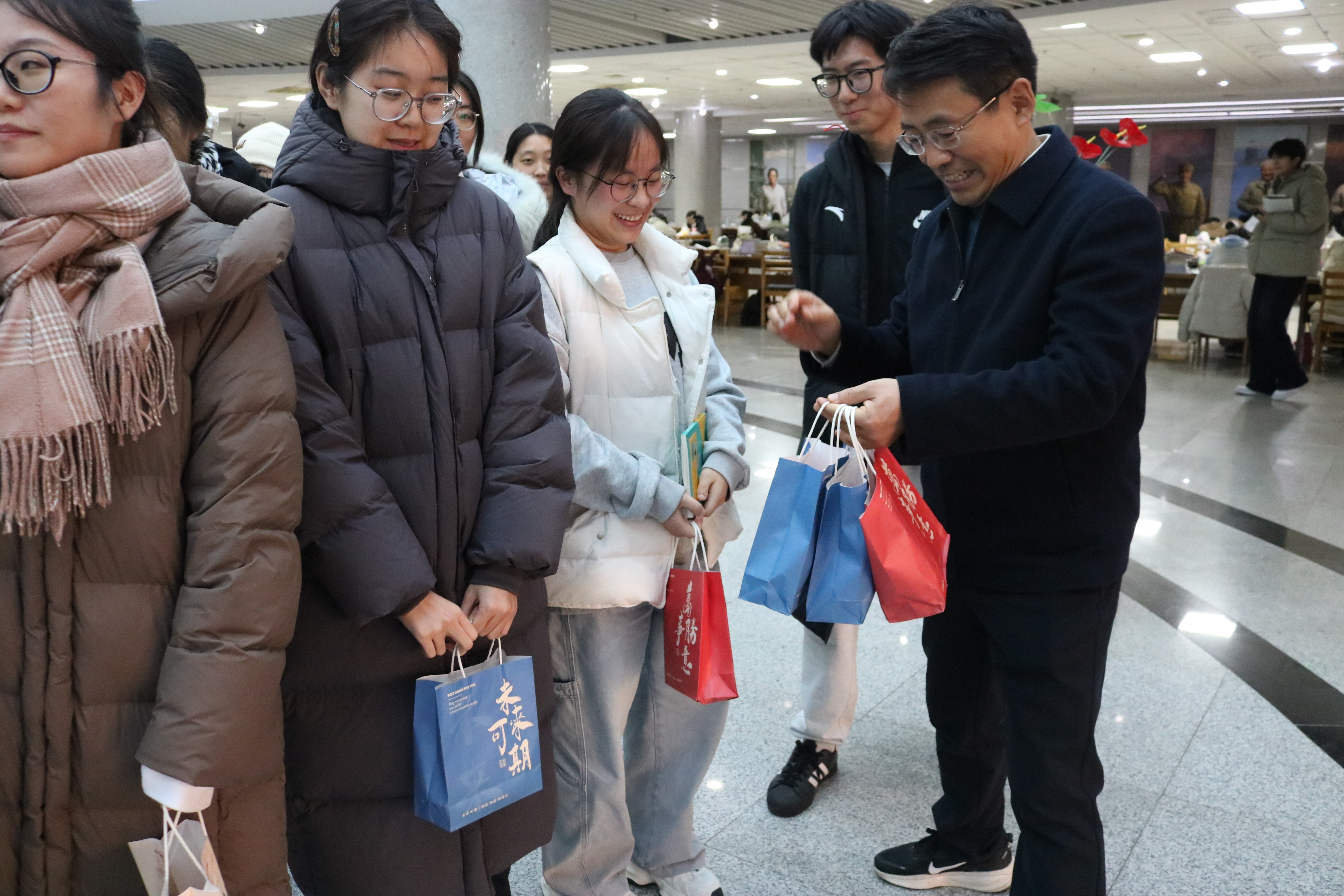 当日下午,图书馆自习室内座无虚席,同学们正埋头苦读、奋笔疾书,浓厚的备考氛围扑面而来。慰问组一行轻步走入自习区域,在不打扰同学们学习的前提下,为大家送上包含学习文具、保暖物资、能量零食、祝福贺卡等在内的暖心礼包。每一份礼包都承载着学院对学子的牵挂,既为寒冬里刻苦备考的同学们带来物质上的补给,更传递着精神上的鼓励。