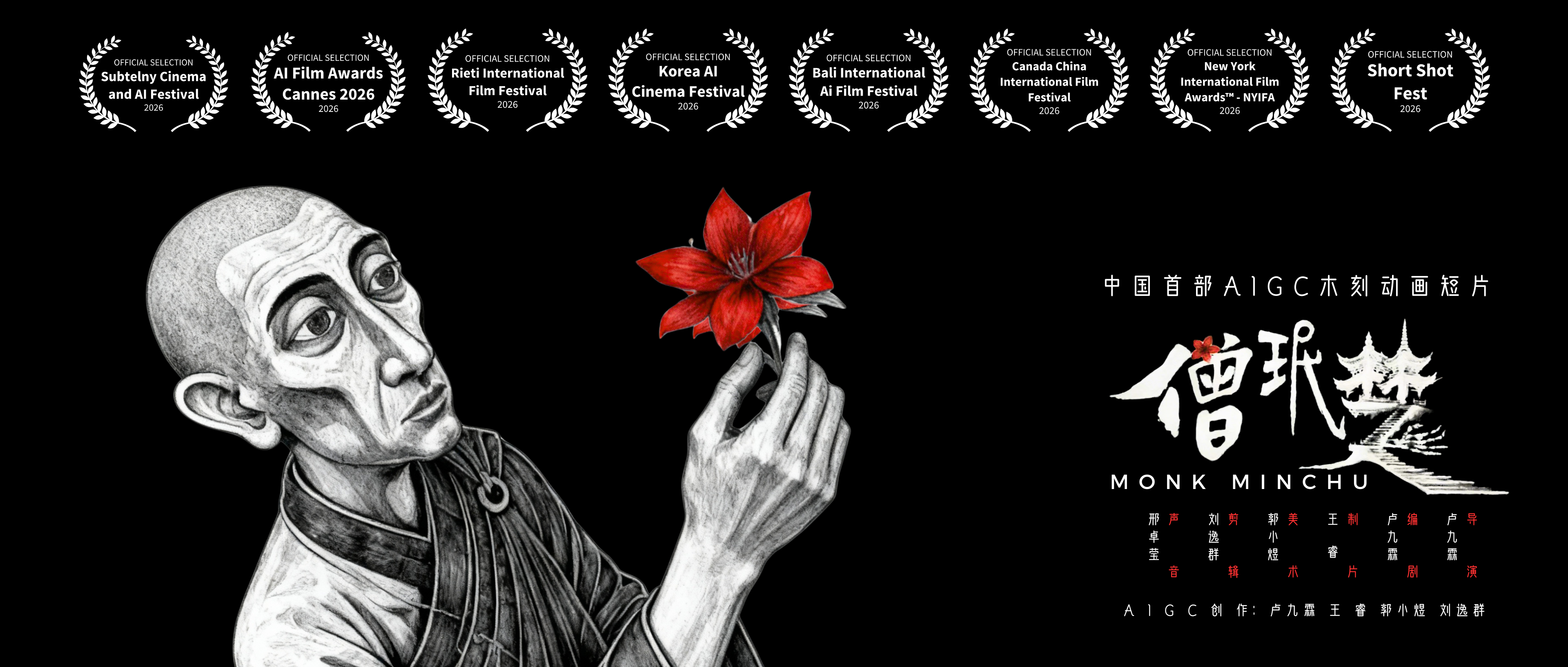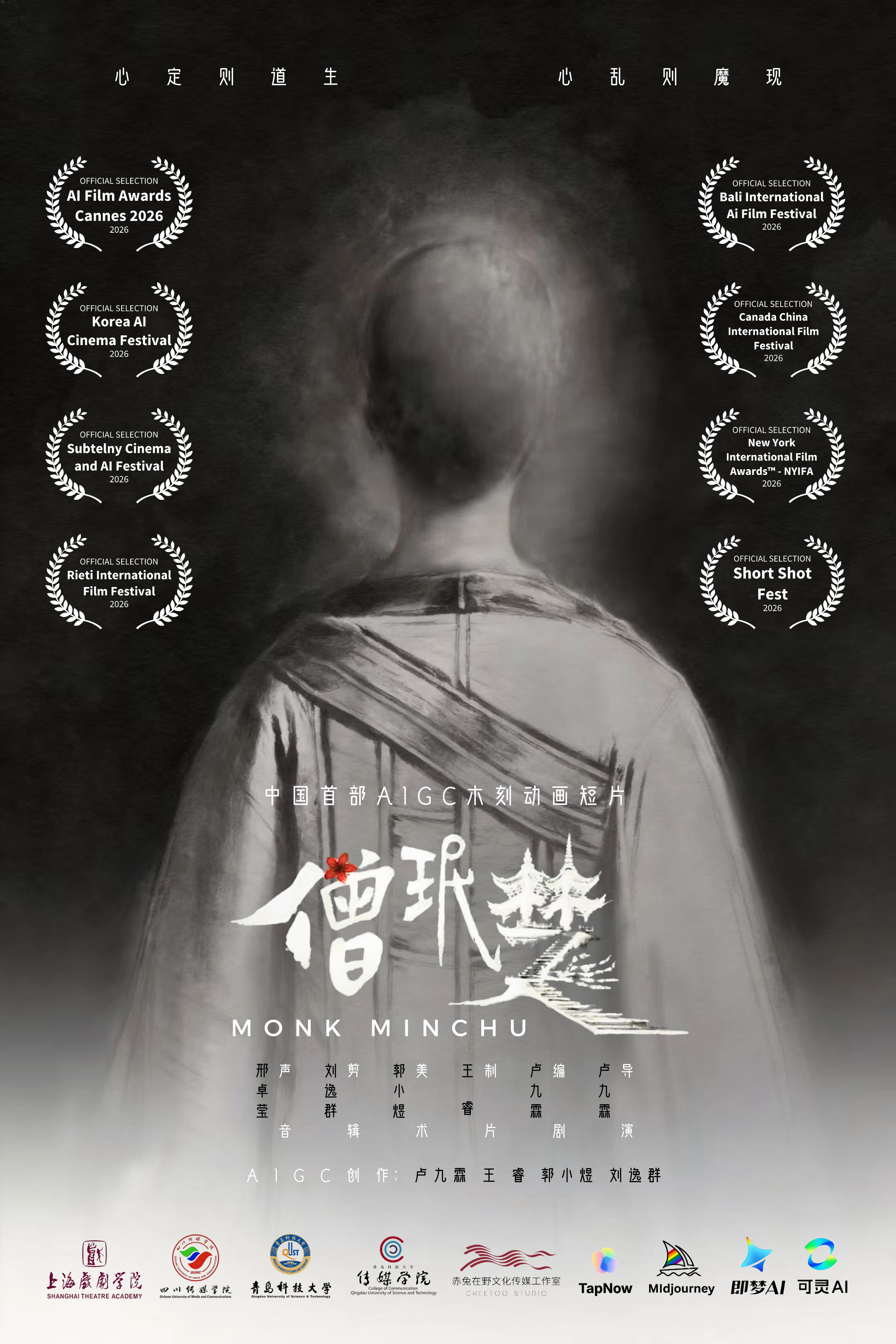 截至目前,《僧珉楚》已接连斩获多项国际电影节认可,成功入围戛纳人工智能电影奖、巴厘岛国际人工智能电影节、中加国际电影节、韩国人工智能电影节、意大利列蒂国际电影节、纽约国际电影奖、波兰Subtelny电影与人工智能电影节、莫斯科国际短片电影节、保加利亚“动画脉动”电影节等多个国际影展。佳绩频传,步履不停,让我们共同期待《僧珉楚》在国际舞台上续写更多精彩!