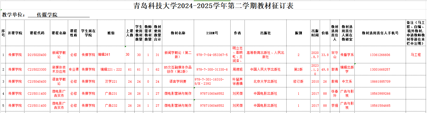 根据教务处《关于做好2024-2025学年第二学期教材选用征订工作的通知》工作安排,由任课老师向各系提交教材选用建议,经电影天堂 选聘教材审读专家对备选教材进行评议,现将电影天堂 2024-2025学年第二学期本科教材征订情况予以公示。公示时间:12月12日到12月18日,如有异议,请在公示期内联系电影天堂 教学办公室,联系电话:(0532) 88959182。