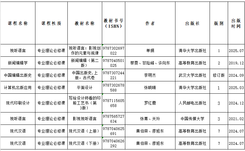 根据教务处《关于做好2025-2026学年第一学期教材选用征订工作的通知》安排,由任课教师提交教材选用建议,经青岛科技大学传媒学院本科教材工作小组集体审议,现将2025-2026学年第一学期本科教材选用情况予以公示。