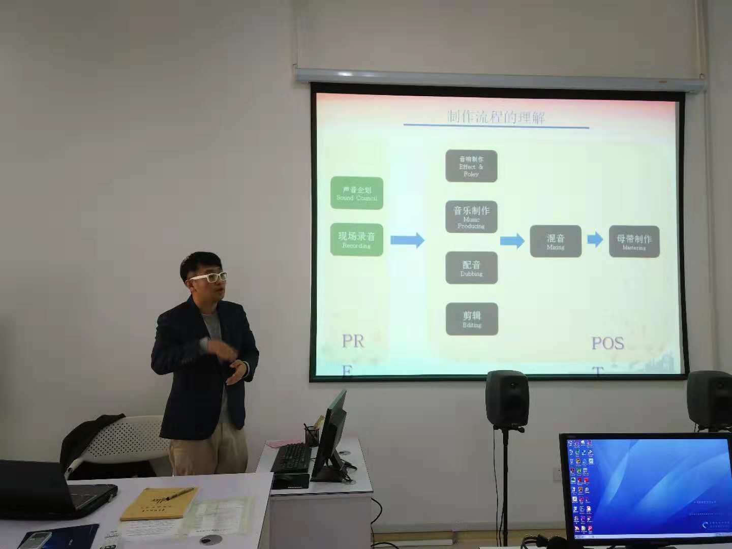 讲座开始,鲁教授向同学们介绍了声音后期制作的整体流程,并结合视频资料,讲解声音创作过程中主流的制作方法。