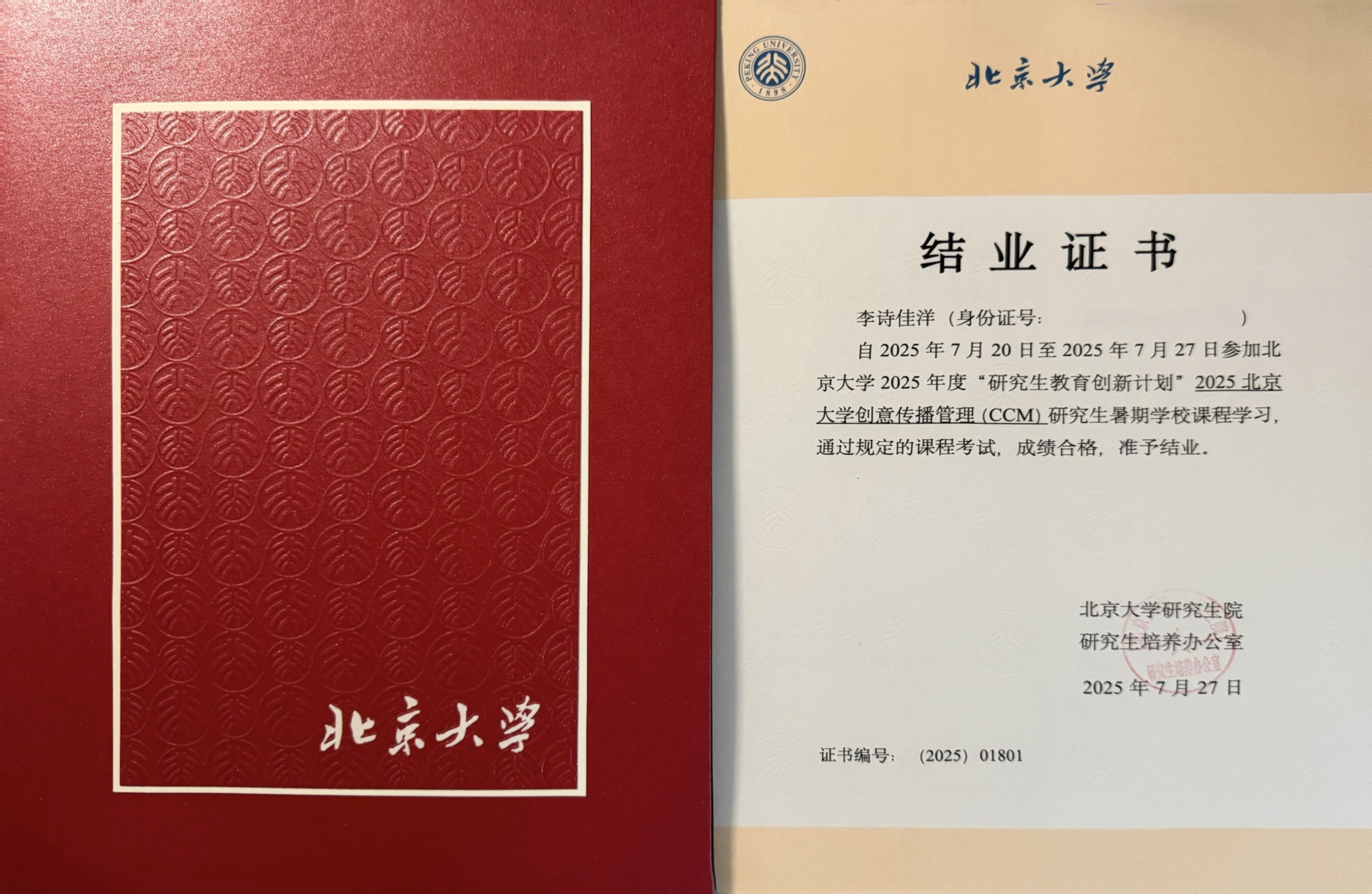 2024级戏剧与影视专业硕士研究生李诗佳洋同学参加北京大学创意传播管理(CCM)研究生暑期学校,并顺利通过课程考试,取得结业证。