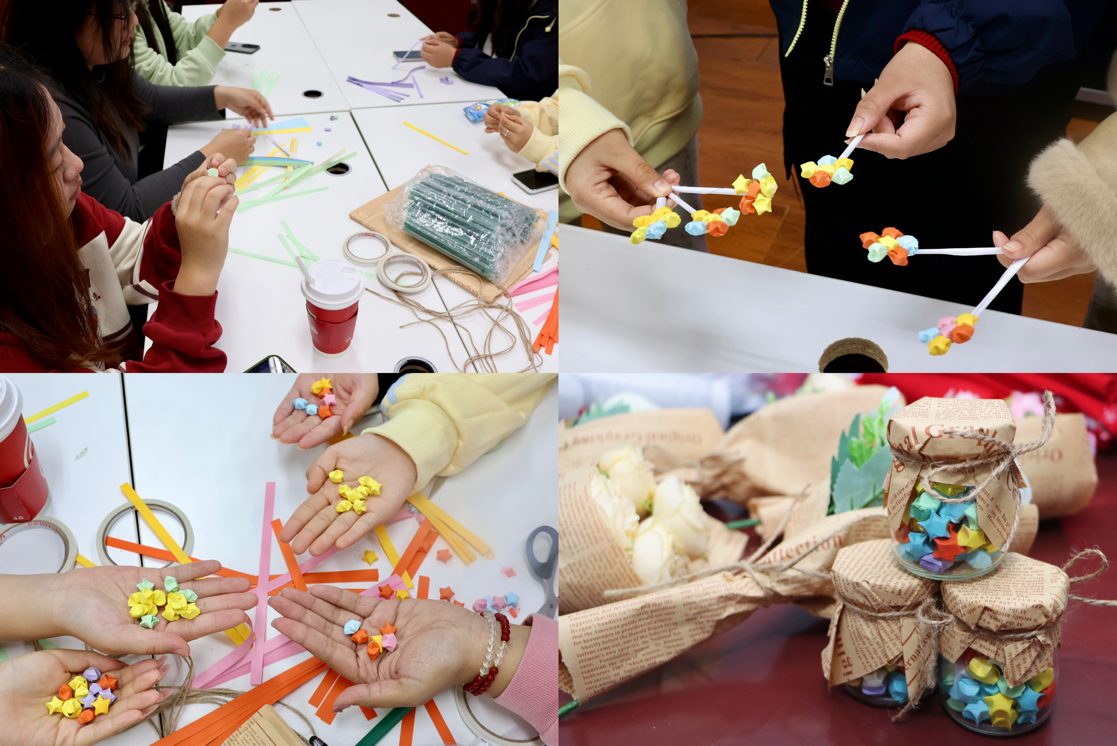 10月21日晚,学院310会议室进行“星星知我心”活动。同学们用星星纸折出星星花,搭配吸管、包装纸组装成花束,在贺卡上写下专属祝福。当指尖的温度融入手工,同学们成为了温情的主动传递者,把对老师的万千感激,藏进了这束永不凋谢的“星星花”中。