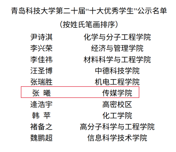 根据《青岛科技大学本科生荣誉奖评选管理办法(修订)》和《关于评选青岛科技大学第二十届“十大优秀学生”的通知》要求,经学院(校区)推荐、资格审核、网络投票、现场评审等环节,最终,电影天堂
