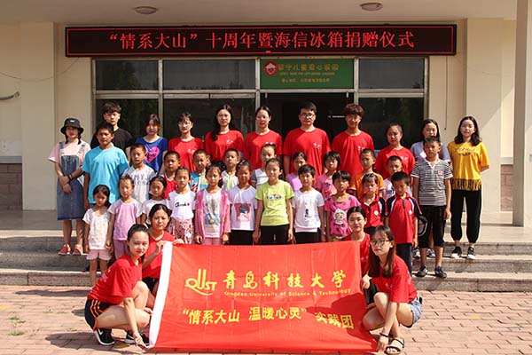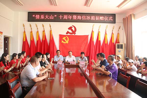 7月19日上午9:00,“情系大山”十周年暨海信冰箱捐赠仪式在临沂市莒南县涝坡镇中心小学会议室举行,出席仪式的有海信集团临沂分公司王总经理,涝坡镇副镇长王家陈,青岛科技大学传播与动漫学院老师于杰亮、徐海寰,海信冰箱总部人员,涝坡镇中心小学校长崔永峰,青岛科技大学“情系大山”志愿者团队,涝坡镇受助学生等。