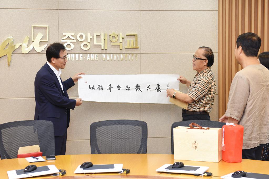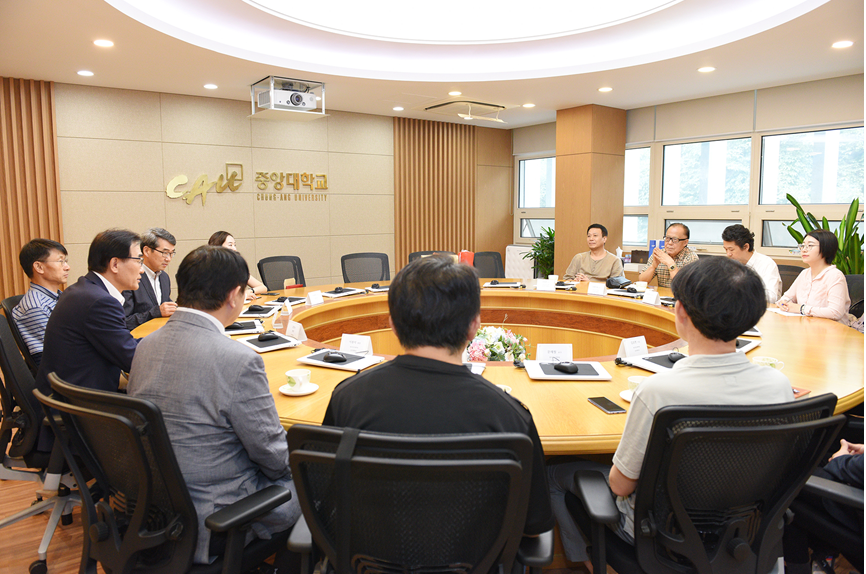 8月23日,金昌洙总长、李忠稙院长、赵东奎组长等与我校代表团进行了深入的会谈。金昌洙总长对袁志发院长一行的来访表示热烈欢迎,他对两校共同合作项目同心协力迎来了第一届毕业生,对青岛科技大学的支持表示了由衷的感谢,相信这一高端教育项目在双方持续的、共同的努力下能够取得更大的成功。金昌洙总长还介绍了韩国中央大学的基本发展历程和优势学科。而且今年将迎来中央大学建校百年庆典,在这样一个重要的时刻,袁志发院长代表青岛科技大学能够来参加中韩艺术硕士项目第一届学生的毕业典礼,是对项目的重视,对两校今后的深度合作意义非凡。李忠稙院长代表尖端影像大学院对代表团一行也表示了热烈欢迎,他表示合作学院和学科的教授们会一如既往尽心尽力地把项目学生培养好,让项目成为中韩艺术硕士合作的典范,并希望与青岛科技大学能够在更广阔的领域进行深层次的合作。