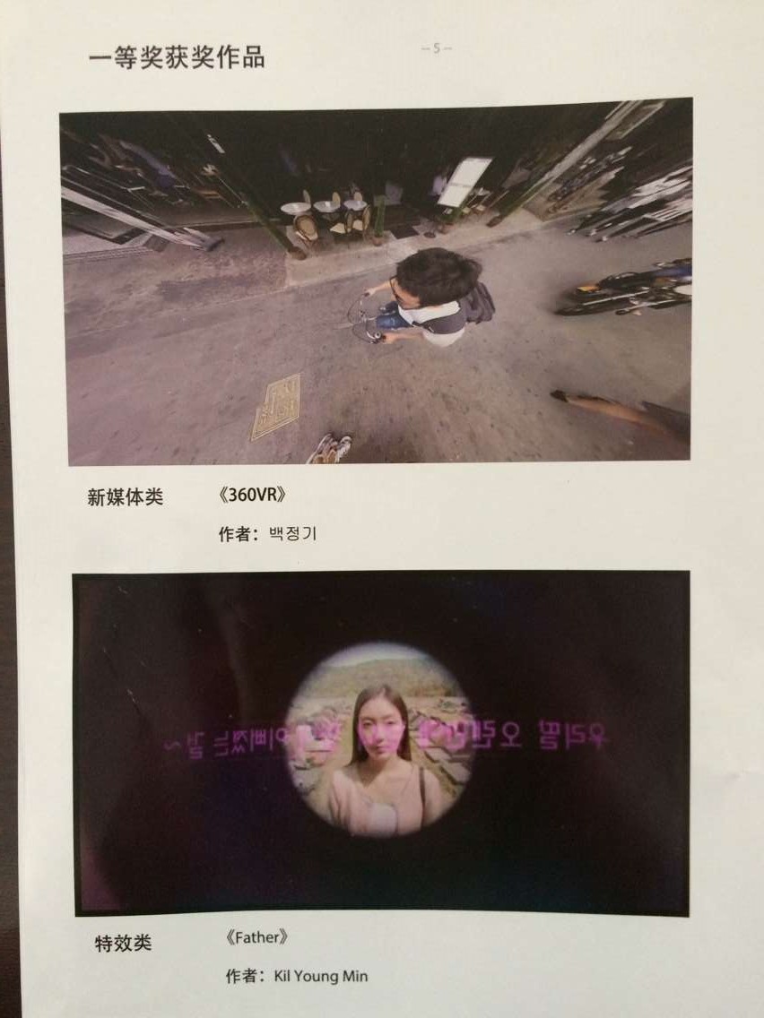 本次活动自今年5月开始以来,共收到来自韩国中央大学、北京电影学院、青岛科技大学等国内外10所高校, 124部作品。经过专家评审,韩国中央大学作品《360VR》获新媒体类一等奖、韩国中央大学作品《Father》获特效类一等奖、北京电影学院现代创意媒体学院作品《温柔的怜悯》获微电影类一等奖、青岛科技大学作品《Fast food》获动画片类一等奖。