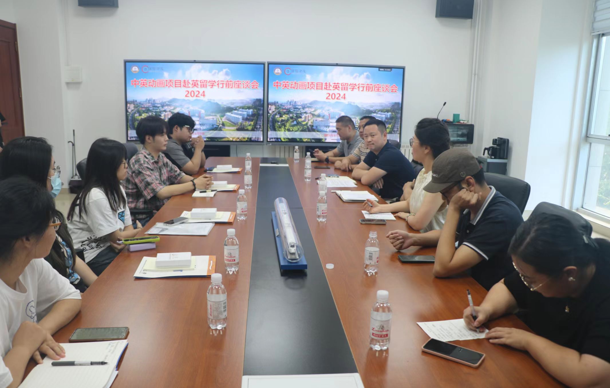 副院长石晨旭、动画系主任陈墨白、副主任徐克彬、中外合作办公室主任刘勇、2021级辅导员金莹莹、动画系讲师陈璐、上海学领教育集团(青岛)王铭,及2021级动画(中英)赴英留学生参加了会议。交流会由电影天堂