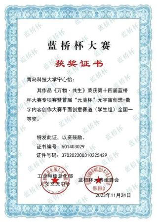 确立保研目标后,中英动画的 “双导师制” 成为我学业与竞赛的 “助推器”。课堂上,科大导师帮我夯实基础理论,布大导师教我如何从全球赛事视角挖掘作品主题。两岸新锐设计竞赛・华灿奖时,最终作品斩获国家二等奖。第十四届蓝桥杯大赛中,我的两项全国一等奖作品《数字生活创想家 —— 元宇宙美术馆》、《万物・共生》,运用了“中外智慧融合” 的创作模式,让我的作品在众多参赛作品中脱颖而出。此外,两篇省级期刊论文的顺利发表,离不开项目的学术支持;参与同济大学与人民网合作的祝福澳门插画长卷项目时,我运用中英课程中学到的 “跨文化视觉传达” 知识,获得项目组认可。